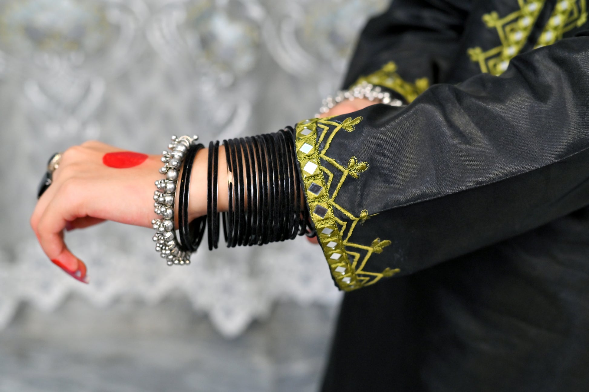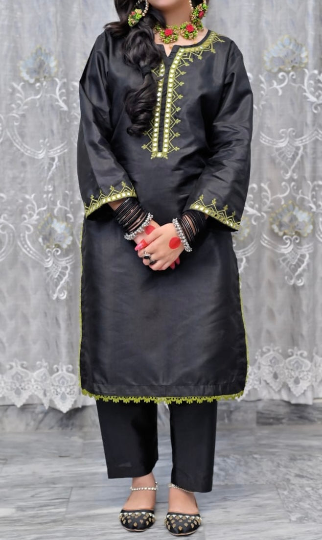 Style: Elegant three-piece set in embroidered cotton silk with intricate sheesha detailing on the shirt, complete with coordinated trouser and dupatta.
