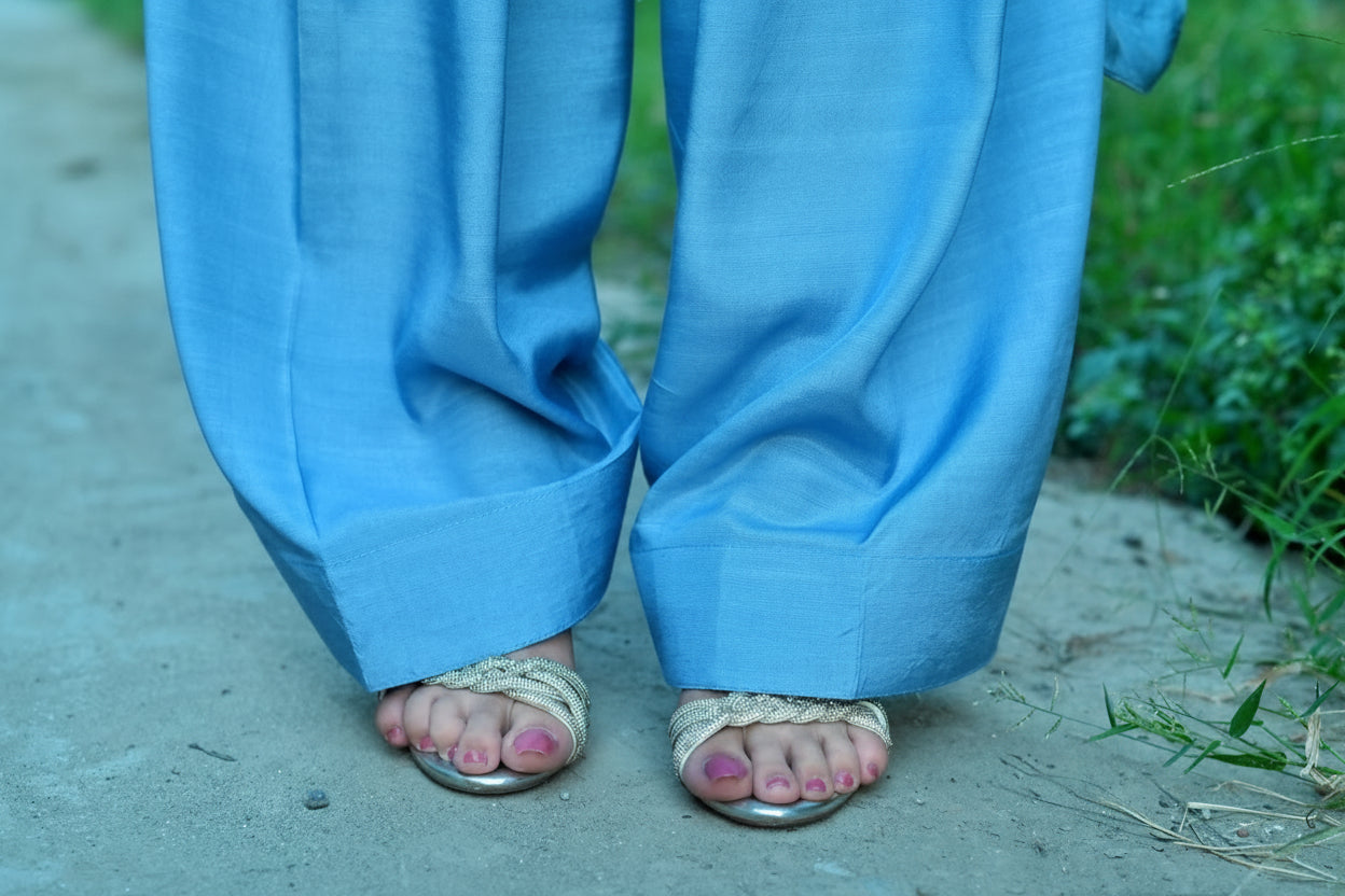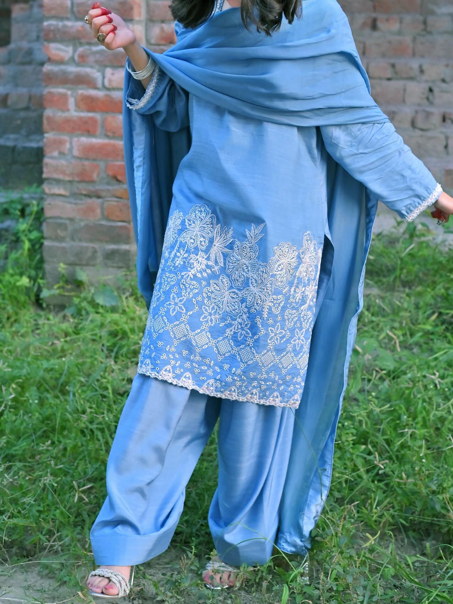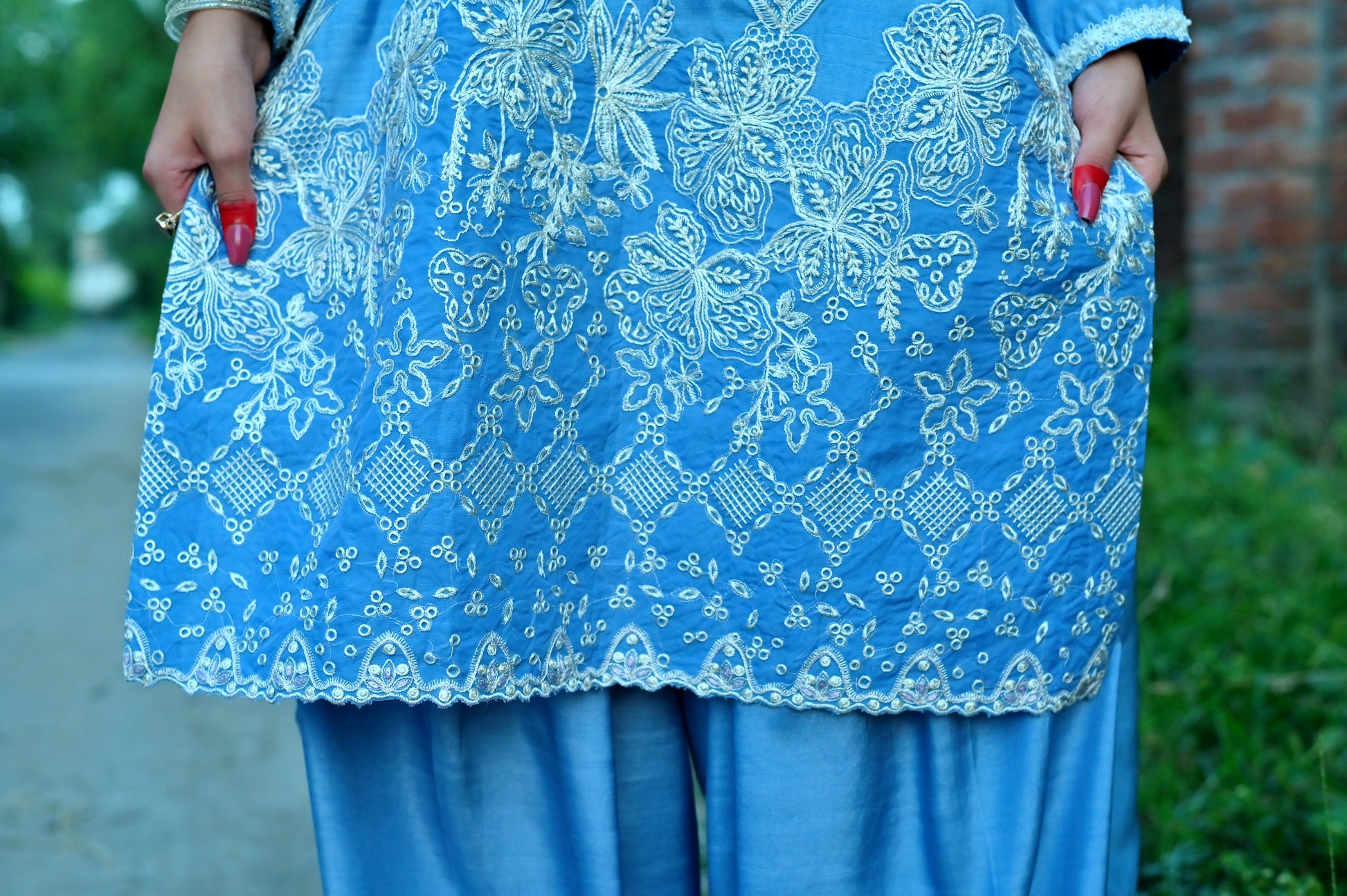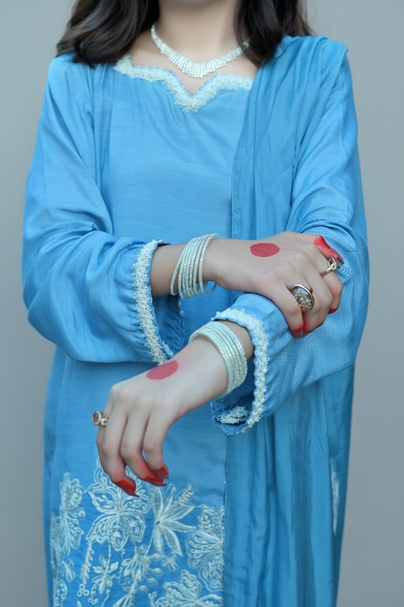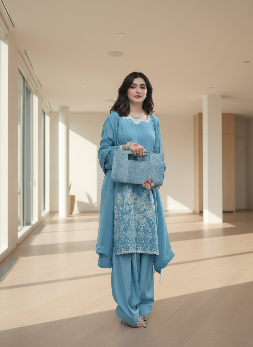 Style: Sophisticated three-piece collection in premium embroidered slub raw silk includes a tailored shirt, coordinating farshi shalwar, and dupatta. Designed for refined elegance with superior fabric quality and expert craftsmanship.