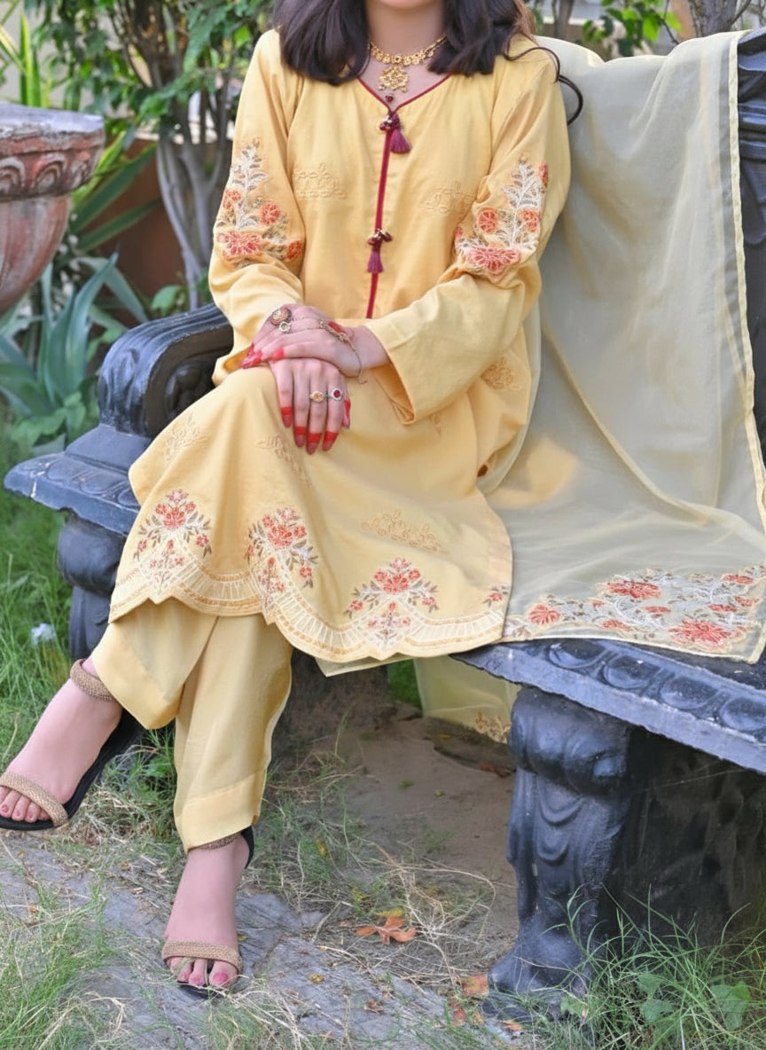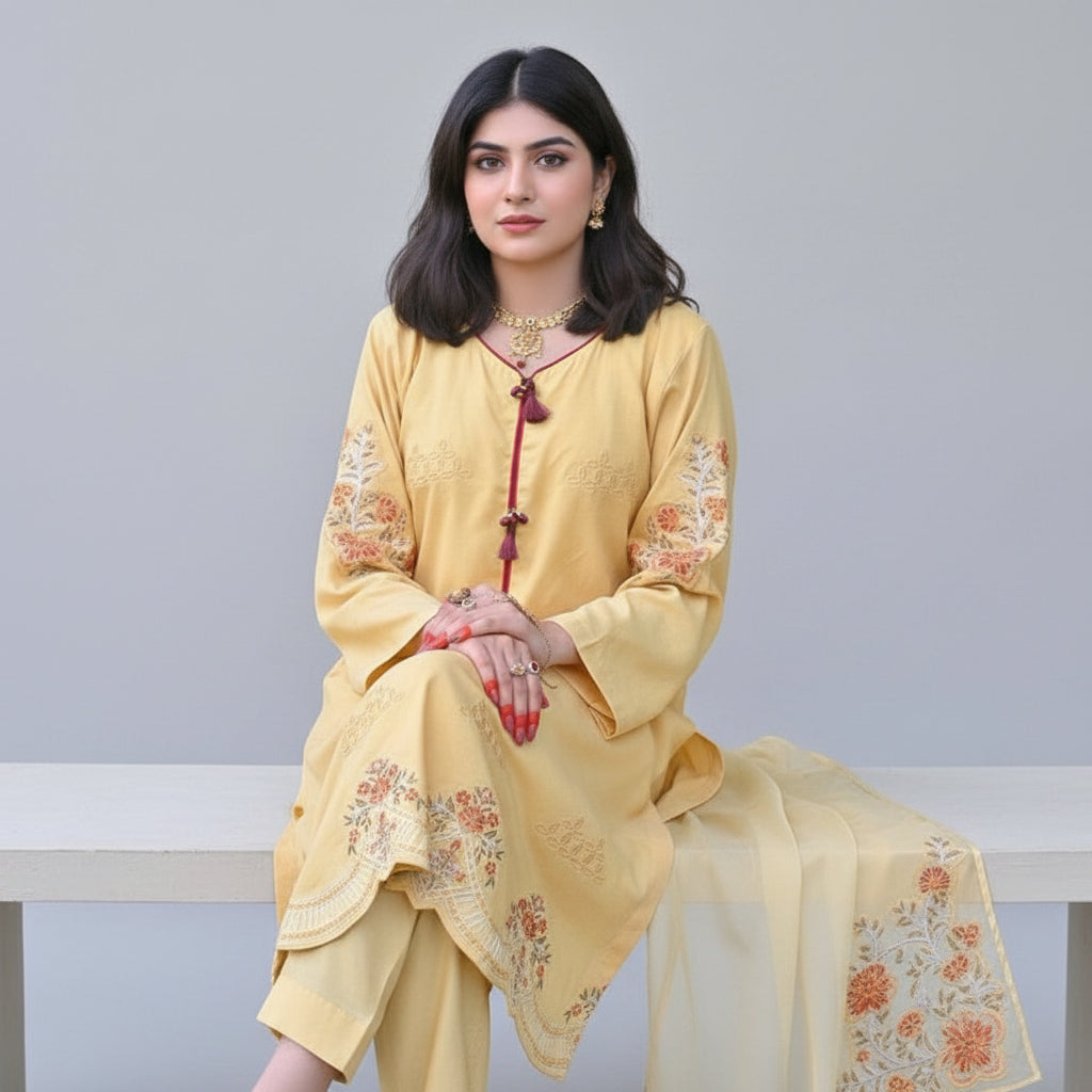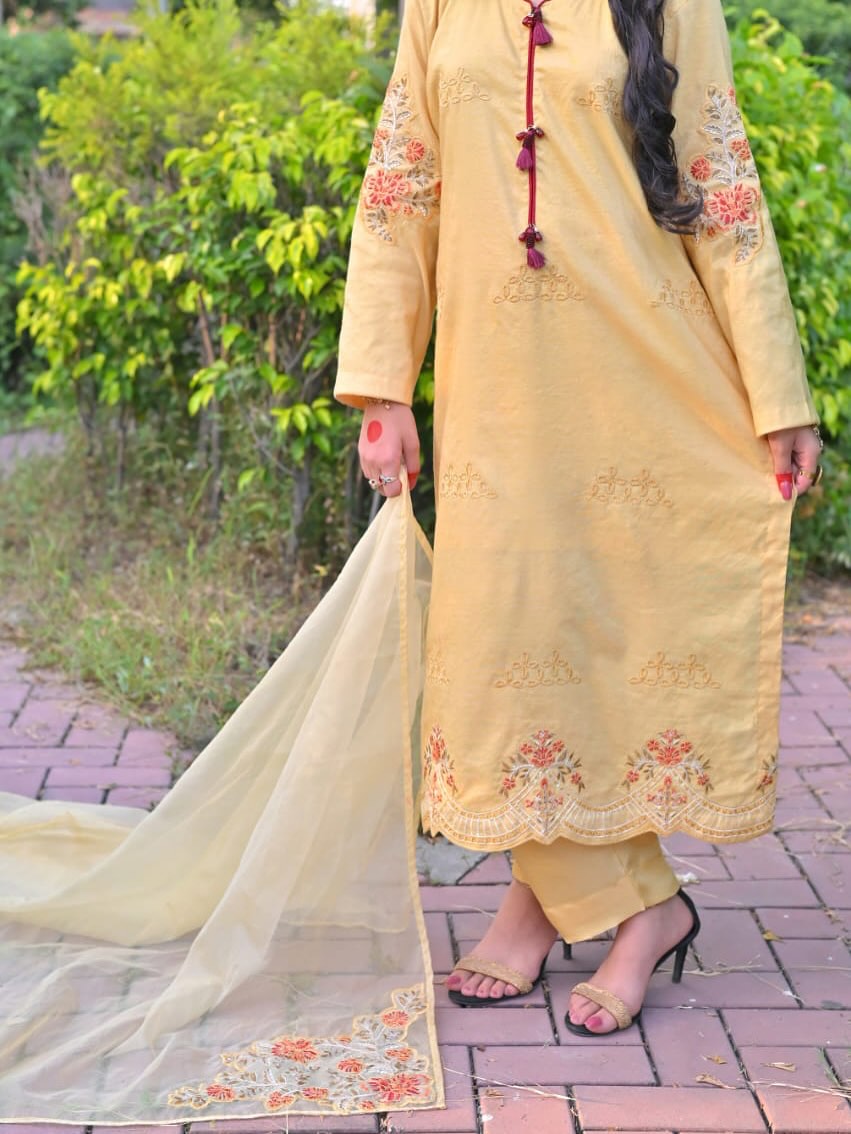 Style: Three-piece ensemble in luxurious embroidered Khaddi Net, comprising a coordinated shirt with slip, trouser, and dupatta.